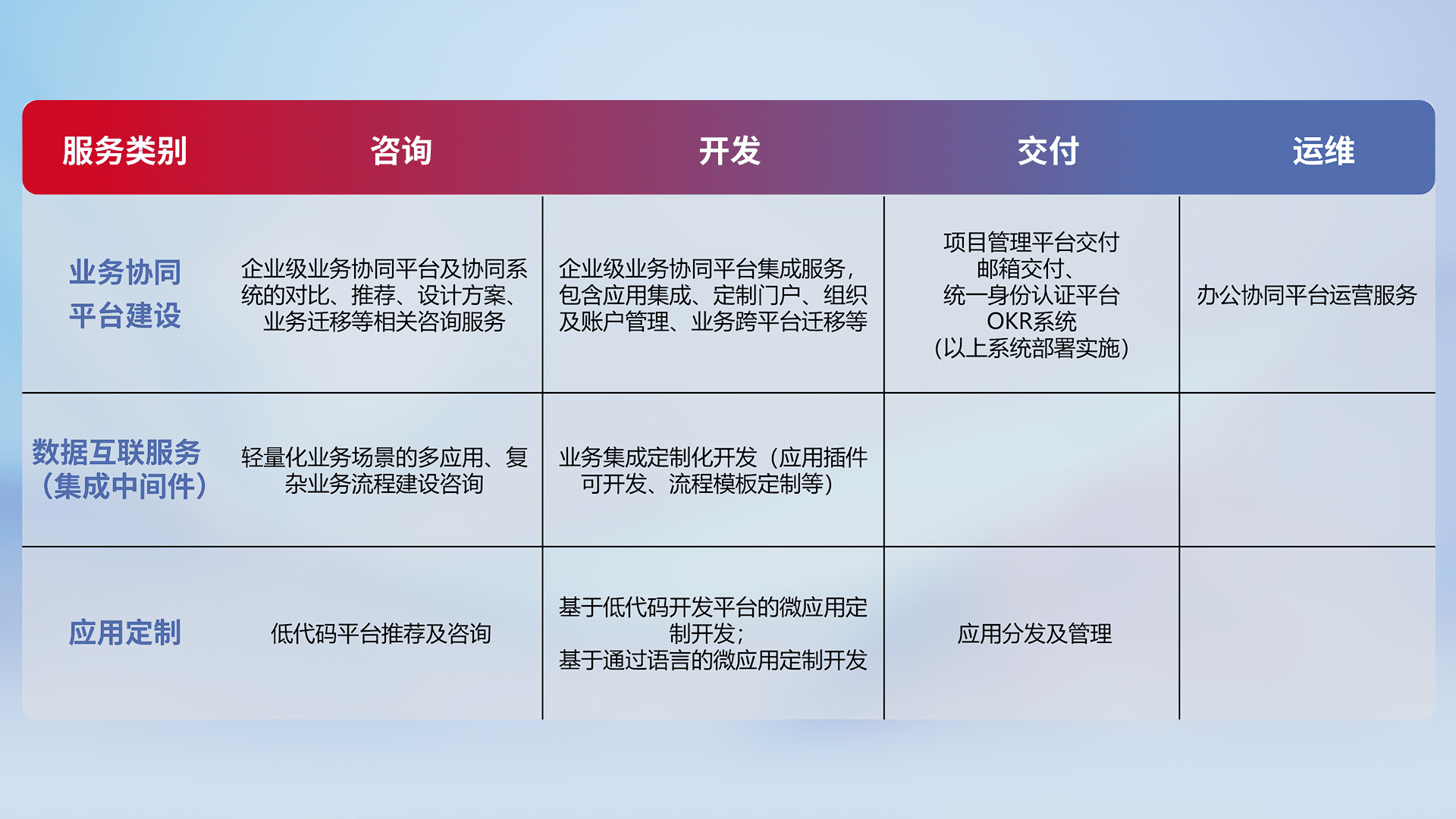 针对钉钉、、、、企微、、IDaas等平台级产品提供产品的规划、、方案、、、交付、、、、定制化开发等服务,,,,实现如统一协同办公、、、智能客户服务、、、混合会议管理、、智能数据查询、、等业务场景,,,,实现数字化转型。。。